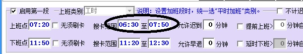 以早上上班时间07:20来说,则科考勤系统设置搜卡范围是06:30-07:50.即06:30之前刷卡无效(结果是旷工),06:30-07:20刷卡正常上班,07:21-07:50刷卡迟到,07:50后刷卡无效(结果是旷工).