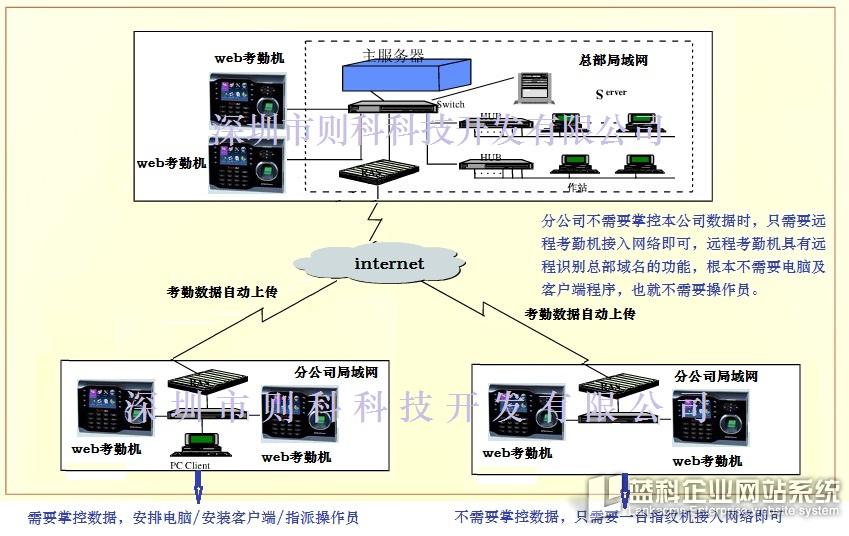 2.则科新概念远程系统,采用B/S或C/S架构都可以,无需总部和分部建立局域网:只需要在总部安装使用软件,分部只需要安装一台考勤机连接到本地交换机,分店能接入INTERNET网就行;维护起来非常方便,因为各分店只是一个考勤机像电脑一样连接到交换机就可以,维护方便简单(考勤机是专用远程考勤机,具有智能网络设备和识别的功能,考勤机会根据有没有打指纹(或其它)考勤数据,及时找到总部域名及服务器,直接上传数据到数据库中,有数据才上传,无数据不占用网络);无需分部提供电脑及无需分部安排操作人员(除非分部也要自行掌控本部的数据),投入成本及采购用户数成本大大降低;我们只需要实施好总部,各分部自行就可以安装和连接好考勤机接入INTERNET网,实施成本和维护成本少......
