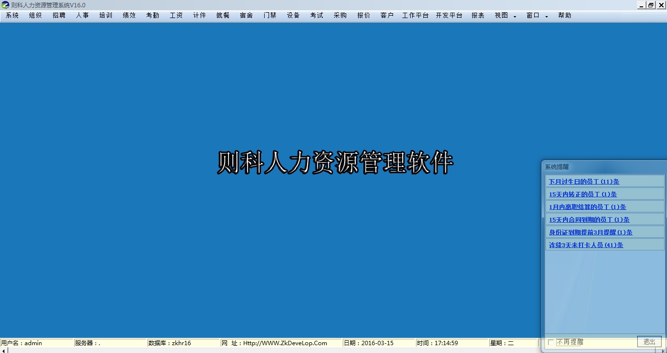 则科新版人力资源管理软件,包括了人力资源各方面的功能模块共计30多个(主要有:系统、组织、招聘、档案、履历、办公用品、奖惩、异动、医疗、保险、体检、证件、积假、合同、培训、绩效考核、考勤、工资、计件工资、门禁、就餐、宿舍、客户、报价、采购、验厂AB账、自助平台、审批流、手机APP应用、报表设计、设备通讯等),支持C/S及B/S双重架构,支持手机APP应用考勤。C/S主界面如下: