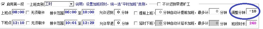 1.由于早上晨会或中途间休,导致总的上班时间上午或下午会多出一些分钟的情况.例如班次A,上午08:00-12:10,下午13:30-17:10,上午和下午分别在10:30和15:00开始有10分钟间休时间.则科班次设置中有自动调整功能,如下图: