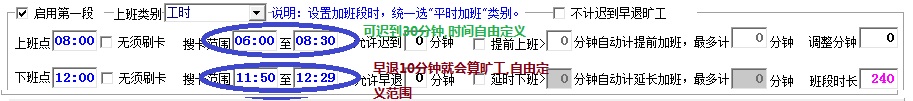 2.公司上班时,上下班刷卡范围是不固定的,迟到或早退多少分钟计旷工也不是固定的,比如08:00上班,超08:30就计旷工,而早退10分钟就要计旷工.需要班次设置可以自动设置打卡开始时间和结束时间的考勤系统.如下图: