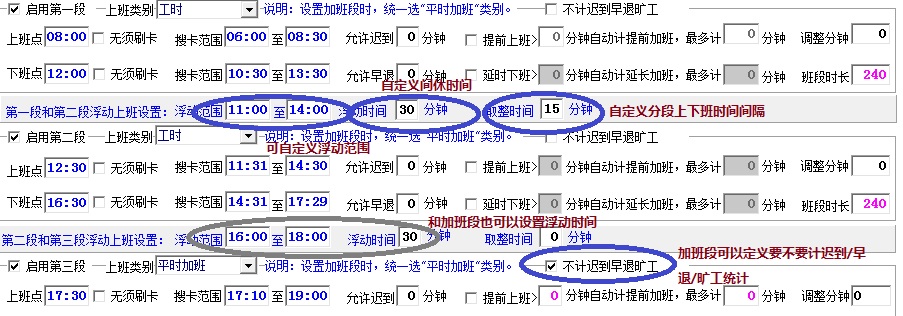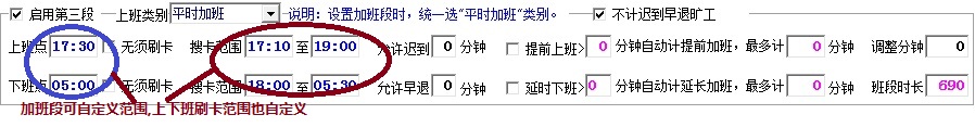 4.一般班次都是有2段,要加班时可能会有3段,可是有些人群(比如清洁每隔几小时上,打扫完又走)可能会有4段,5段.如下图(换个地方截图,班次定义中截图会太大不方便看):