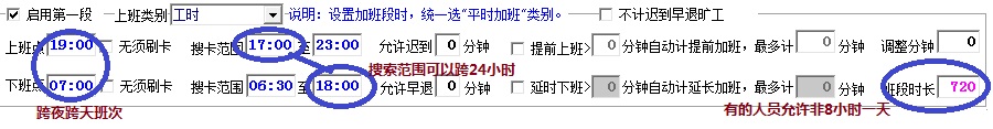 6.班次可以跨夜\跨天\跨24小时,因为特殊情况(比如值班,财务总账等)偶会加班特别晚.次日晚来或休息.如下图: